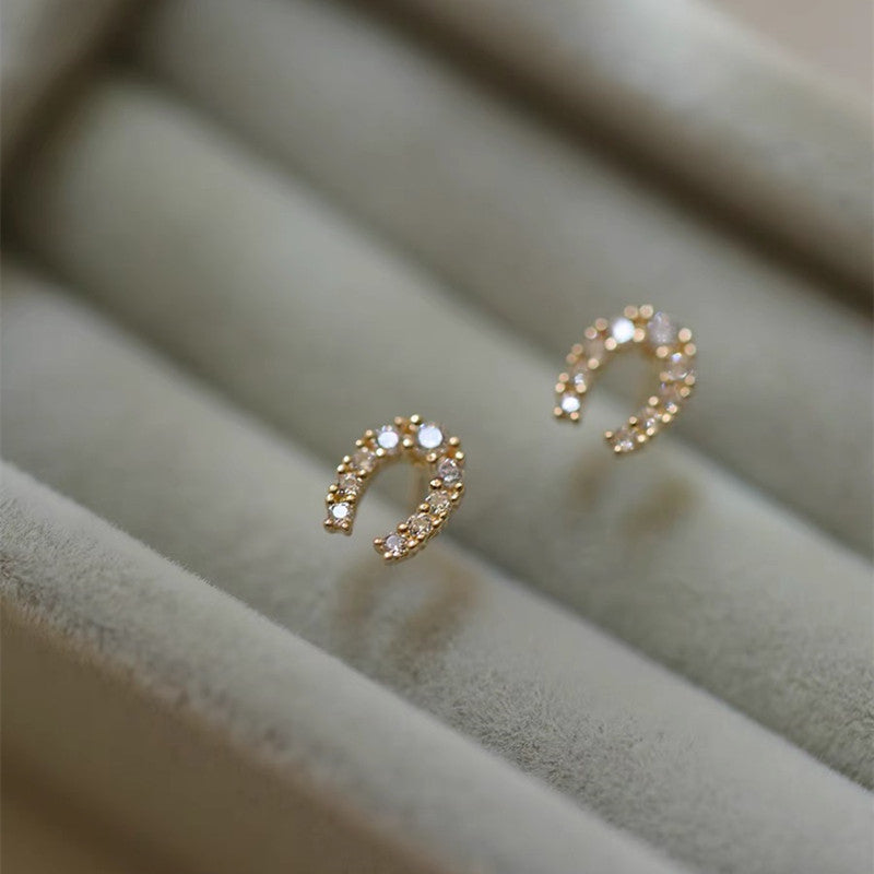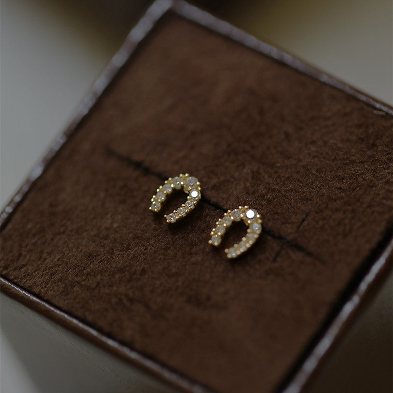 クリスタルストーンが可憐に輝く小な馬蹄(ホースシュー)のピアス。昔から幸運をもたらす形とされており上向きの馬の蹄鉄には、U字のくぼみのところに幸運が溜まると考えられています。逆U字型の蹄鉄は、不運を落とすと考えられております。