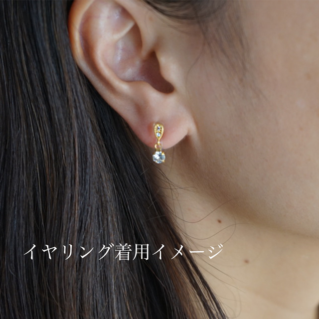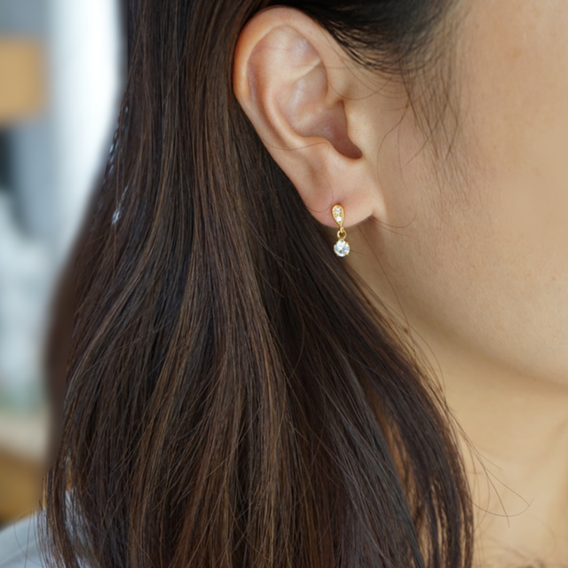 18kgpを使用した逆ドロップ型ピアスの下でチロチロと揺れるスワロフスキーが美しい上品なピアスに仕上がりました。耳元の金具にはキュービックジルコニア が2粒埋め込まれておりキラキラと輝きます。