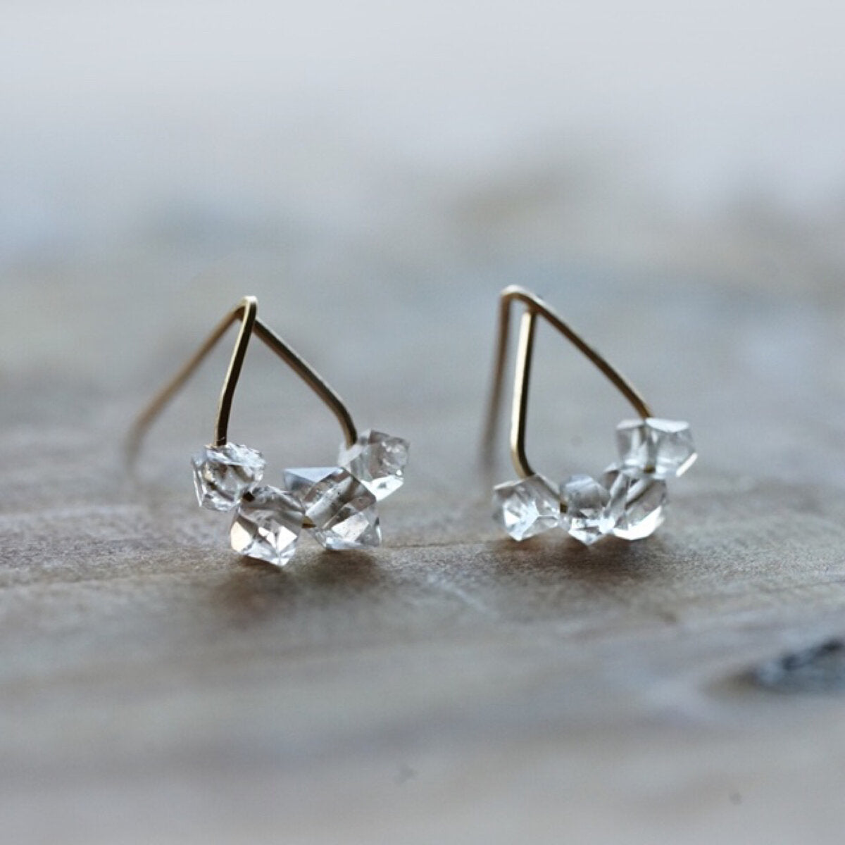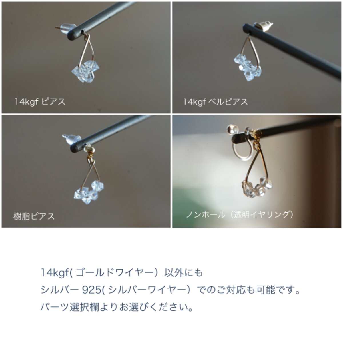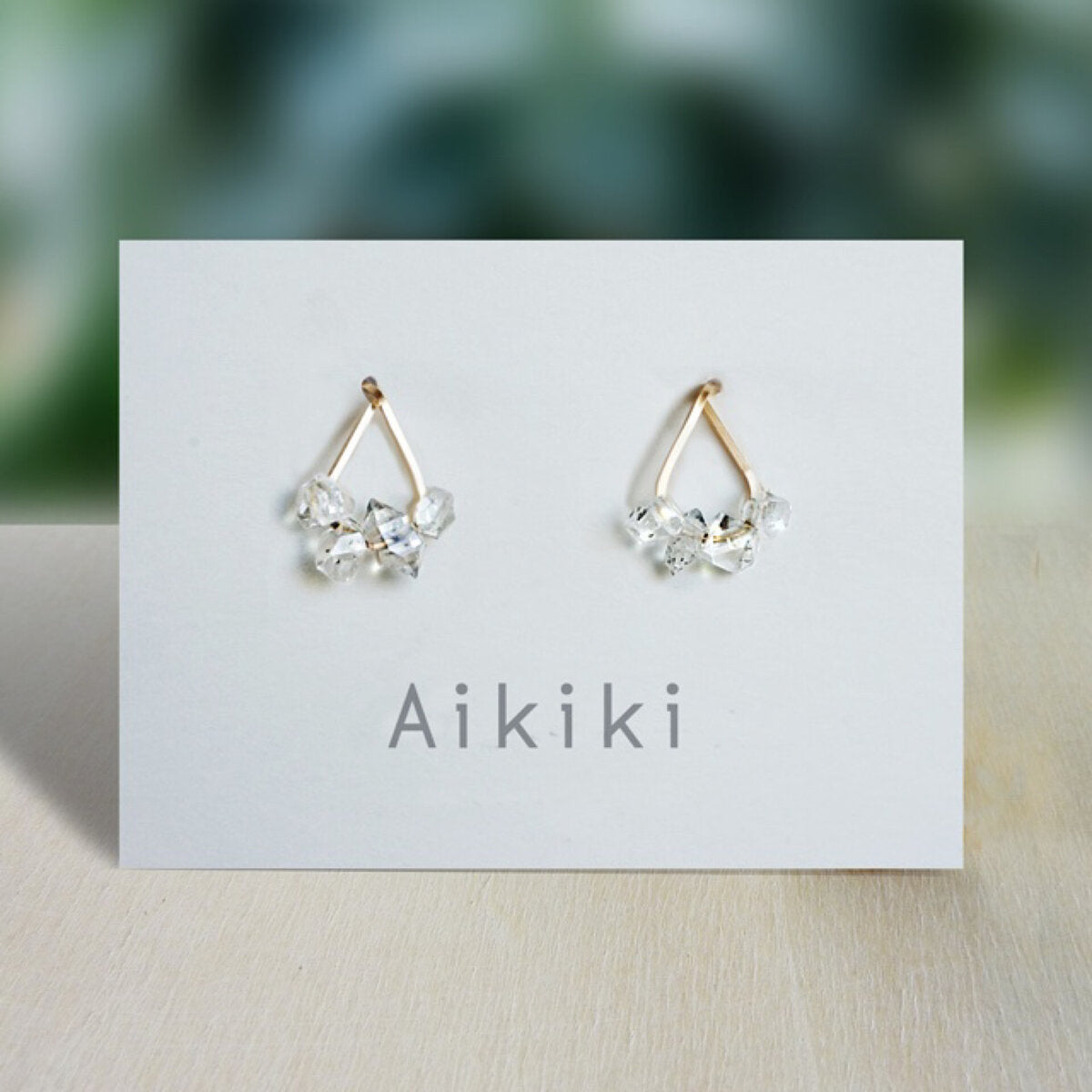 エッジの効いた14KGF(14K Gold Filled)スクエアワイヤーを使用。雫型に吊るされたハーキマーダイヤモンドの原石がキラキラと輝き、氷の花束のような上品で美しい輝きを放ちます。普段使いから、パーティー、結婚式などにも、幅広い場面で、お使いいただけます。大切な人へのプレゼントなどにもいかがでしょうか。